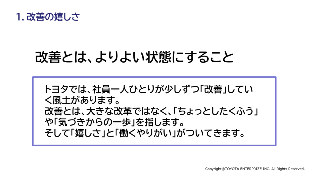 これと一緒とは言わないまでも、重要なのは「カイゼンすることが当たり前」の文化を、会社全体に醸成することです。